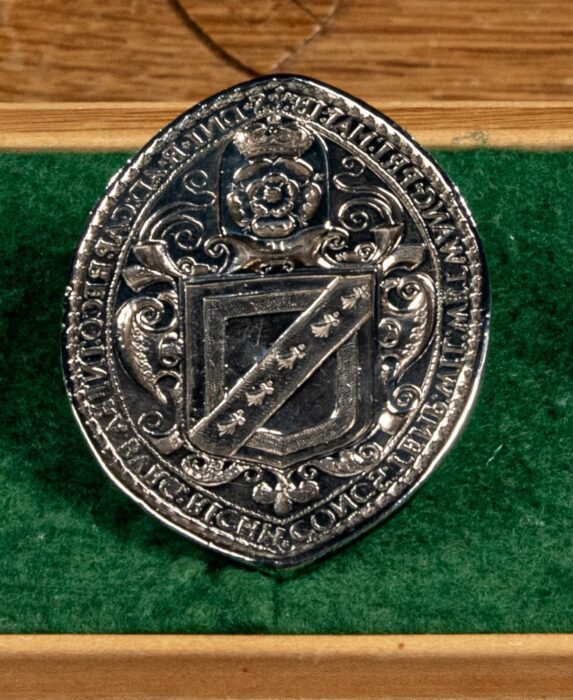 The Lascelles seal is the newest seal in the collection, presented to the Town of Richmond by Sir Thomas Lascelles in 1603. Thomas was an Alderman or council member in Richmond. The seal is inscribed “THIS SEAL WAS GEVEN / TO THE TOWNE OF RICHMOND BY / SER. THOMAS LASCELES / KNYGHT IN THE YEAR OF / V LORD GOD 1603 HE BEINGE / THAN ALDERMAN IN THERE”.