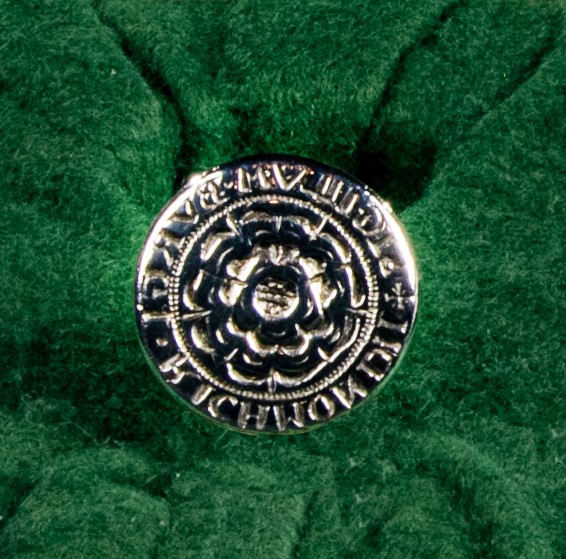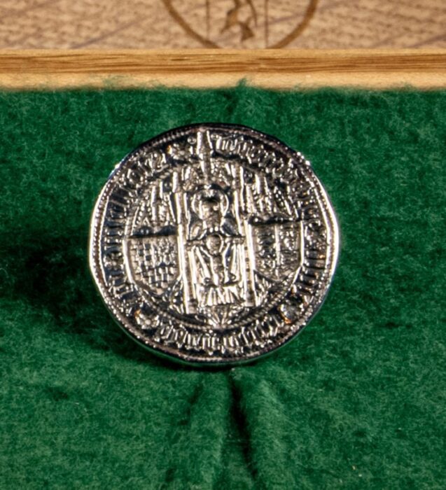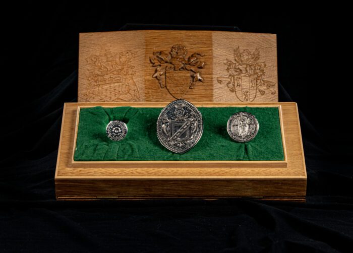 The Common seal is the oldest piece of silver in Richmond Town Council’s collection, likely granted in the early 1400s. It is circular with a depiction of an older man, likely God, with long beard and halo around his head. Two shields complete the design showing the arms of the Earls of Richmond and the Dukes of Brittany.