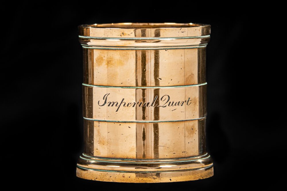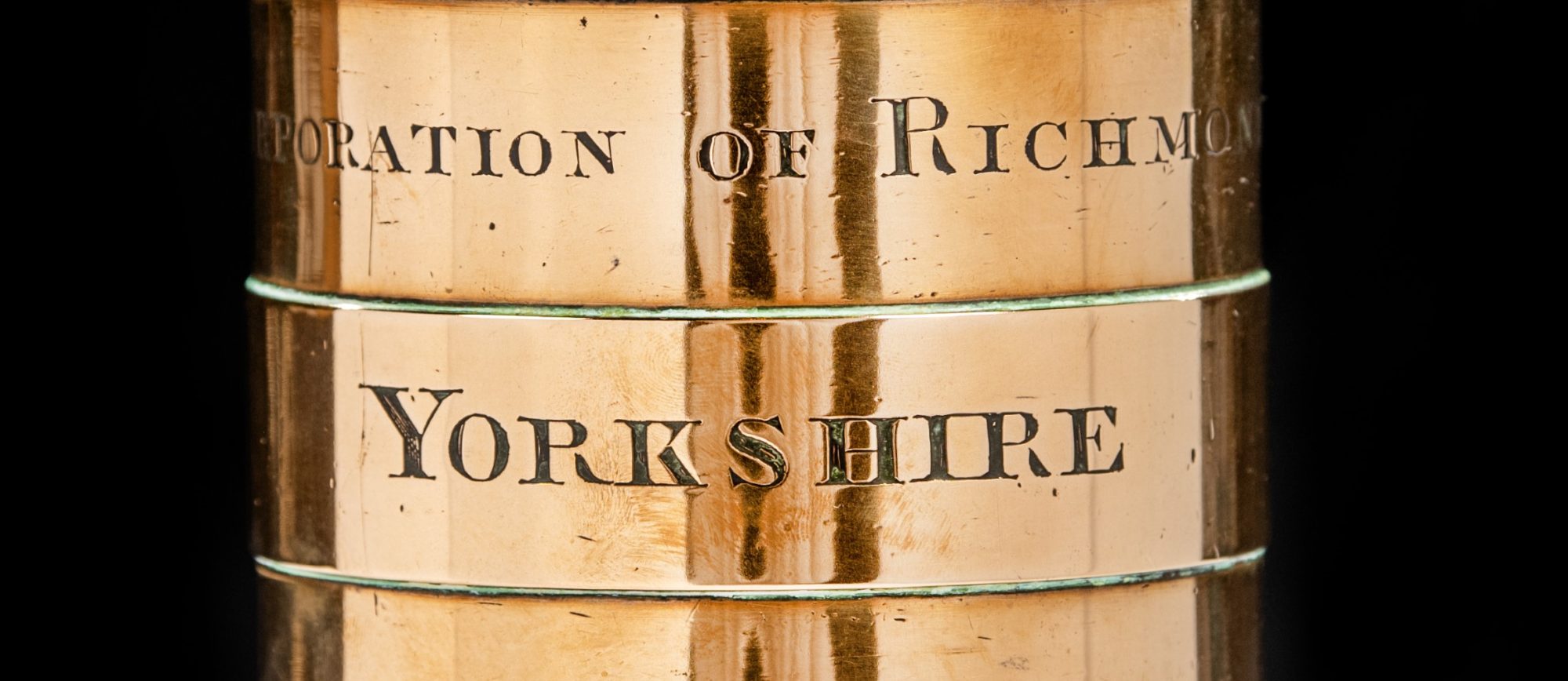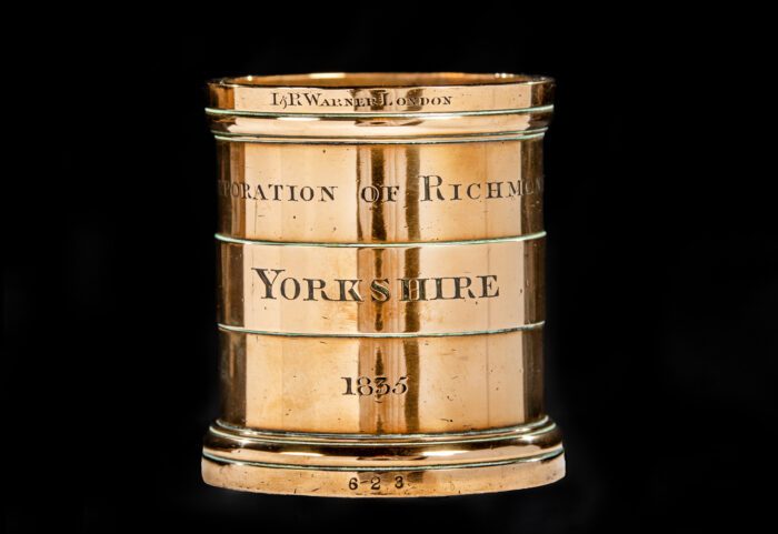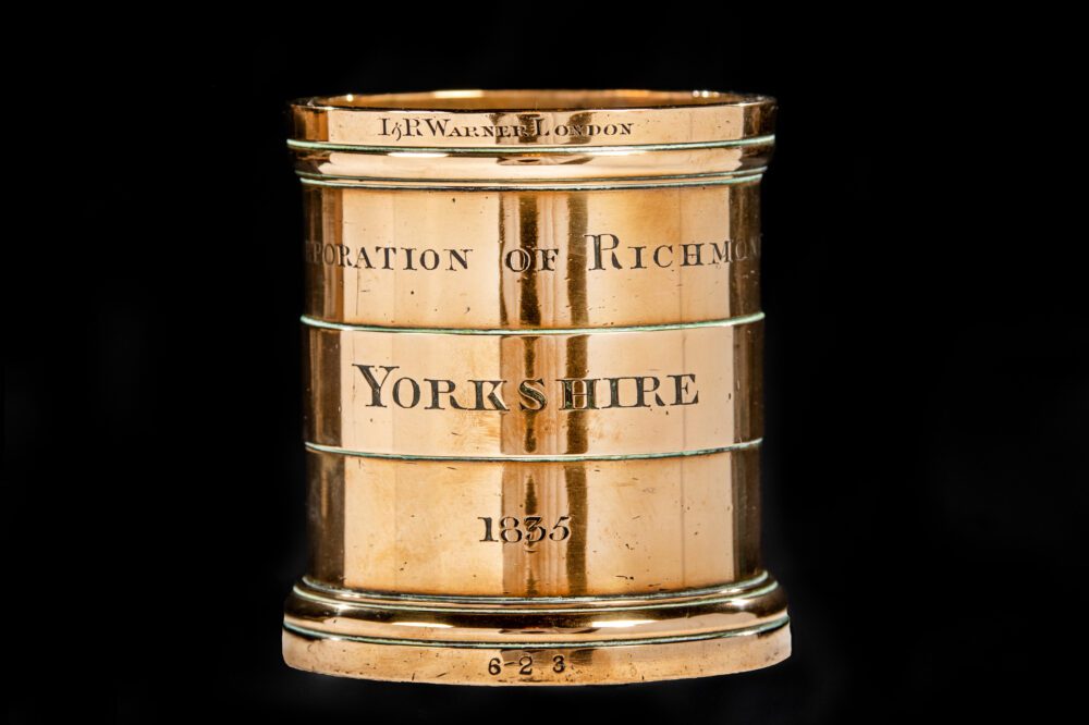 The First Fruits Harvest, or something similar features in almost every religion around the world, where thanks are given to God, gods or deities for the food grown in preparation for winter. Unusually, the event in Richmond is of a civic rather than religious nature. The Corporation of Richmond made income from tolls when the harvest was brought to market to be sold. The corn trade in the 1830s was economically vital, with a large proportion of farming land ploughed to produce corn for flour. This corn cup is brass and takes a measurement of volume called a Quart (a little more than 1 litre). It was made by J Warner & Sons, London and used from 1835 onwards.