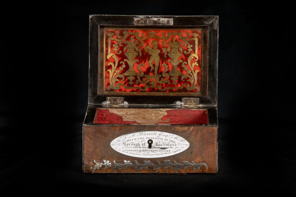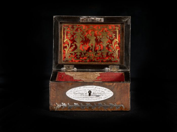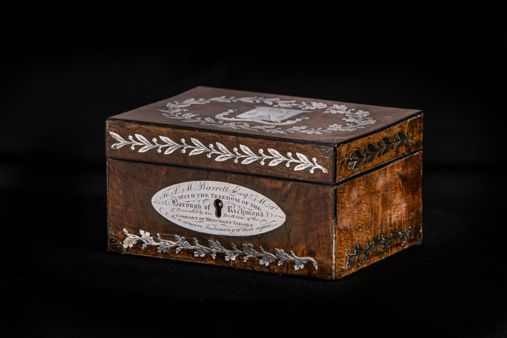 A small, oak casket inlaid with delicate silver oak leaves on all sides. On the lid is the crest of the Merchant Tailors who presented the casket to Samuel Moulton Barratt MP in recognition of being granted the Freedom of Richmond. The casket contains the original sealed document granting Samuel this honour. The interior of the lid is lined with tortoiseshell inlaid with brass, called boulle work after the French cabinet maker André-Charles Boulle (1642-1732).