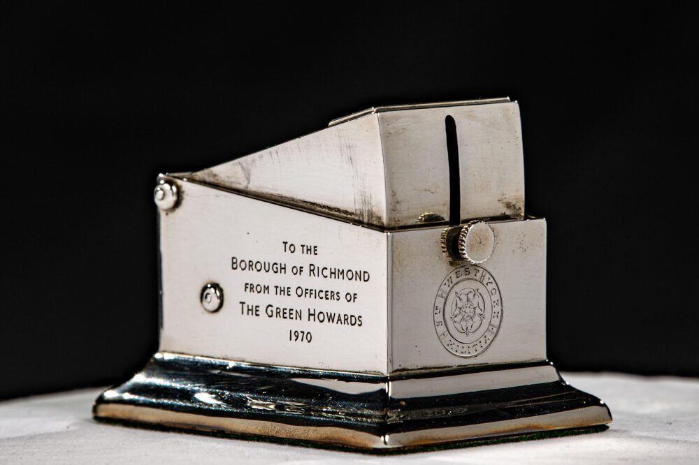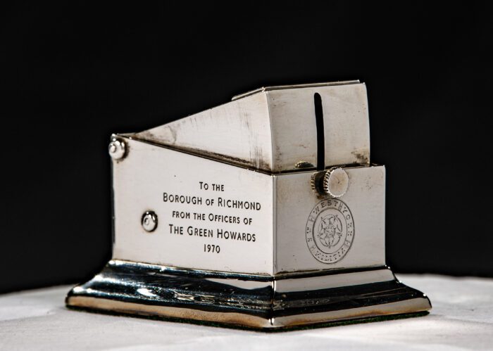 This silver cigar cutter represents the connection between the Green Howards regiment and its home town of Richmond. It was presented to the town on 3rd July 1970 by Colonel John Forbes on behalf of the Green Howards.