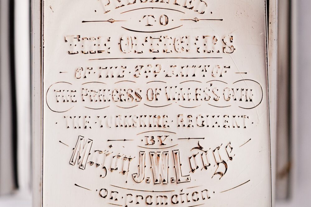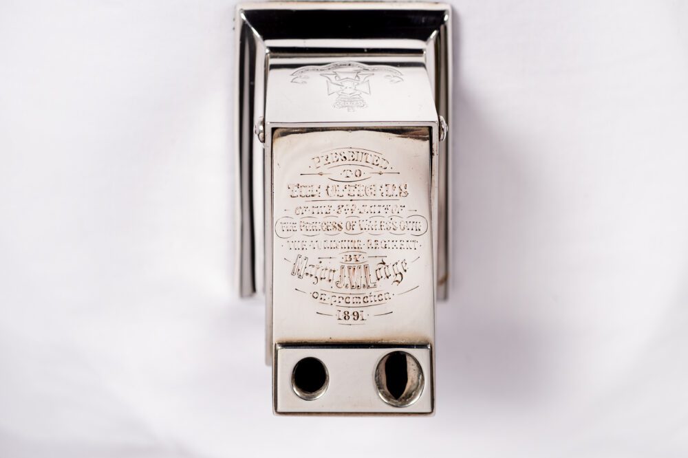 It had originally been presented to the 3rd Battalion The Princess of Wales’s Own The Yorkshire Regiment (a previous name for the Green Howards regiment) by Major John Lodge when he was promoted in 1891. The cigar cutter was made by William Gibson and John Langman of Regents Street, London in 1890, who co-owned a large jewellers and silversmith retailer from 1880-1898.