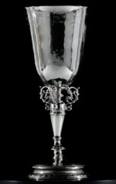 Robert gifted this silver cup to the Corporation of Richmond. The cup has a plain silver bowl above a knopped stem (globular ornament mid-way on the stem) decorated with 3 scrolls and a raised decorated foot. It was made 1595-1596 in London by an unidentified goldsmith (markers mark AB within a shield over a tun or wine cask). It was inscribed at a later date to mark the good fortune of his survival.